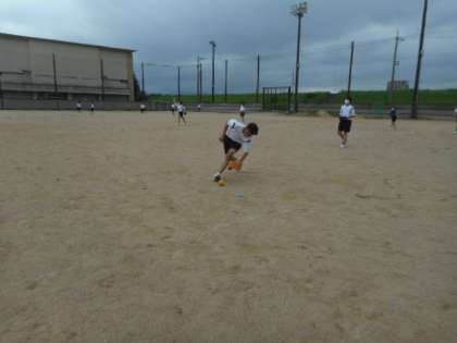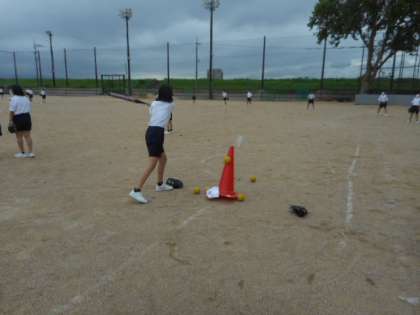 1−Aの体育の授業風景です。ティーバッティングから守備の練習をしました。なかなかバットに当てて飛ばすのは難しいようですね。生徒は、声をかけ合って元気に取り組みました。