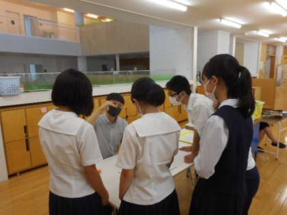 3−Cの英語の授業風景です。ALTの先生との授業では、英語を使った絵本作りをしました。分からないところは、ALTの先生に積極的に質問しました。