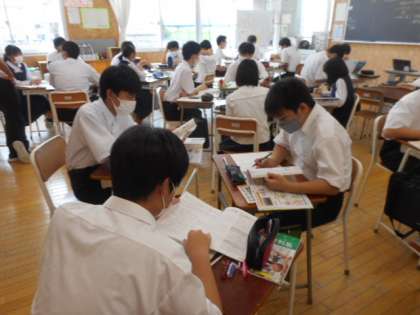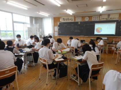 3−Aの社会科の授業風景です。国民主権について考えています。グループになって意見を交流させたり、クロームブックを活用して資料を読み取ったりしながら、考えを深めました。