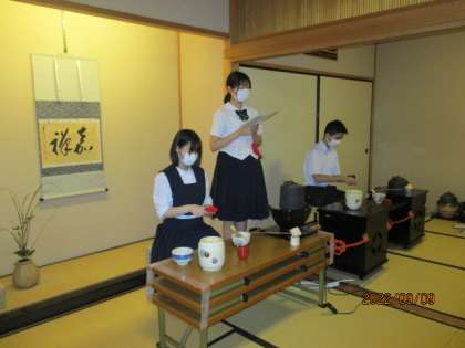 今日の部活動(茶道部) 公開日 2022/09/10 更新日 2022/09/10 芝園の一日 9月9日(金) 「芝園茶会」まで、あとわずかになりました。本番を想定しての稽古をしました。部員たちの気持ちも入ってきました。当日をお楽しみに!