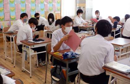 3−Bの英語の授業風景です。3年生の英語でも、ペアで確認することを取り入れています。お互いに積極的に質問をしている様子が見られます。