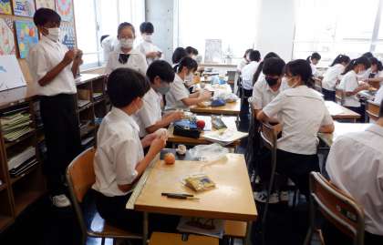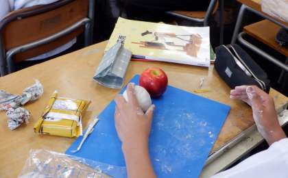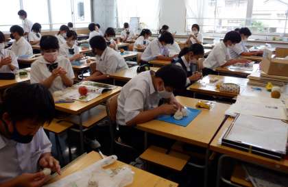 1−Bの美術の授業風景です。紙粘土で、自分の身近なものを作っています。果物や野菜、石ころ、松ぼっくりなど、様々なものにチャレンジしています。