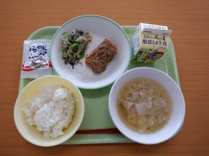 今日の給食 公開日 2022/09/15 更新日 2022/09/15 芝園の一日 9月15日(木) 今日の給食メニューは、 ・ごはん ・牛乳 ・揚げ出し豆腐のごまだれかけ ・豚汁 ・ゆかりあえ ・味杖け小魚 です。 揚げ出し豆腐は、甘辛いごまだれがとっても美味しかったです。