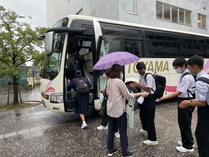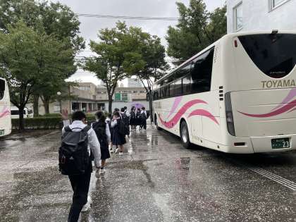 1学年校外学習 その1 公開日 2022/09/21 更新日 2022/09/21 芝園の一日 9月21日(水) これから高岡方面に向けて出発します。あいにくの雨模様ですが、生徒は元気よくバスに乗り込みました。高岡の文化を学習してきます。