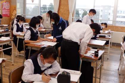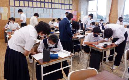 2−Aの数学の授業風景です。1次関数のグラフを求める問題。お互いに、教え合って理解を深めています。分からないところがあれば、分かるまでとことん質問をしよう!授業が勝負ですよ!