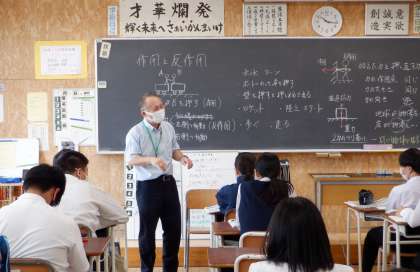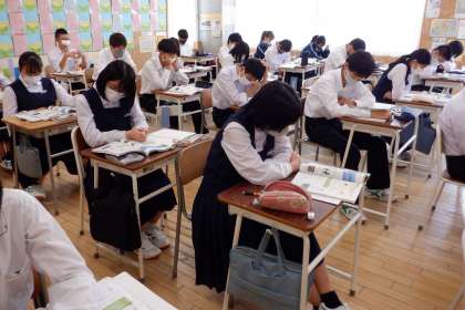 3−Bの理科の授業風景です。「作用・反作用」について学習をしています。宇宙空間での力の働きを想像しています。