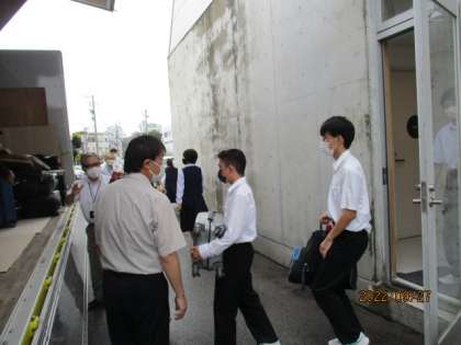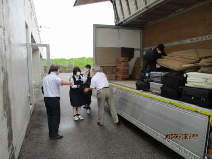 明日からいよいよ修学旅行が始まります。今日は、大きな荷物を先に宿泊先へ送るために、バスに積み込みました。生徒は、間近にせまった修学旅行に向けて晴れやかな表情でした。