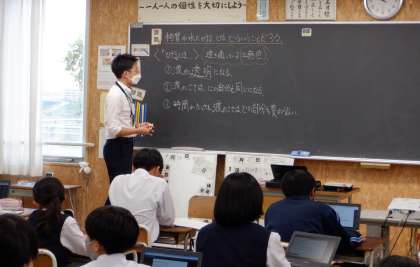 タブレットを活用して 1−A理科 公開日 2022/09/27 更新日 2022/09/27 芝園の一日 9月27日(火) 2限 1−Aの理科の授業風景です。「物質が溶けるとは」という課題で学習をしています。タブレットで実験の動画を見たり、重要な語句を確認したりと有効に活用しています。