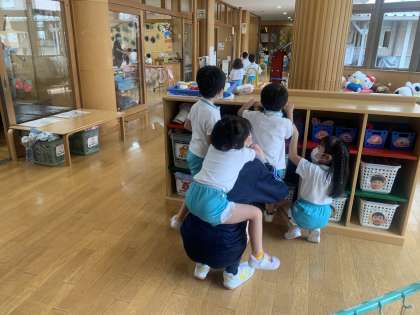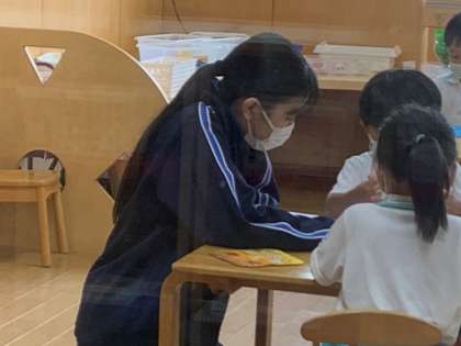 徳風幼稚園では、午前中園児と一緒に遊ぶ姿が見られました。写真はかくれんぼをしたり、一緒にお絵かきをしている様子です。子どもたちは「おねえちゃん先生と遊ぶの楽しい!」と嬉しそうに話していました。担任の先生からも「子どもたちの人気者です」と褒めていただいています。