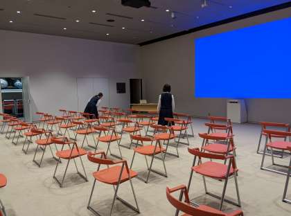 社会に学ぶ「14歳の挑戦」 富山県美術館 公開日 2022/09/27 更新日 2022/09/27 芝園の一日 9月27日(火) 午後からのイベントに向けて、会場の準備をしています。 手際よく準備に取り組んでいました。