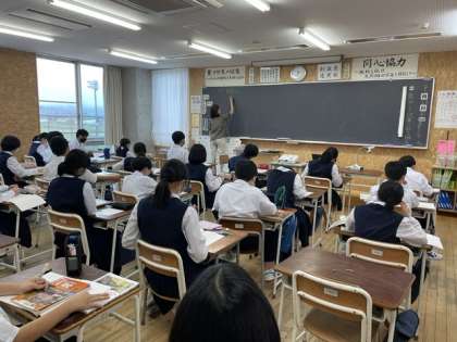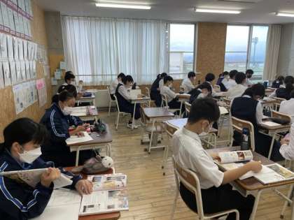 1ーAの社会の授業風景です。歴史分野の学習をしています。資料から読み取ったり、出来事が起こった背景について考えたりしました。