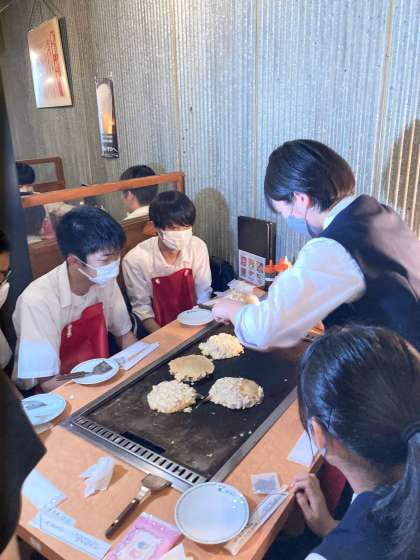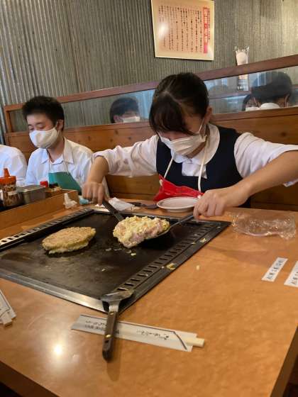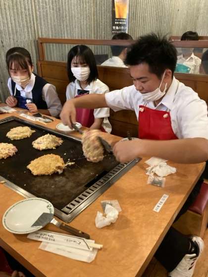 9月29日(木) お好み焼き体験の様子です。いよいよ鉄板で焼きます。おいしくできるかな〜