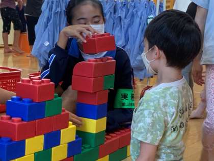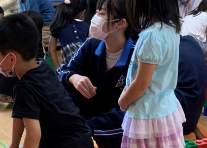 のぞみ保育園では、子どもたちが遊戯室で遊んでいる様子を見守っていました。生徒自ら「上手にできたね」「すごい」と優しく声をかけていました。