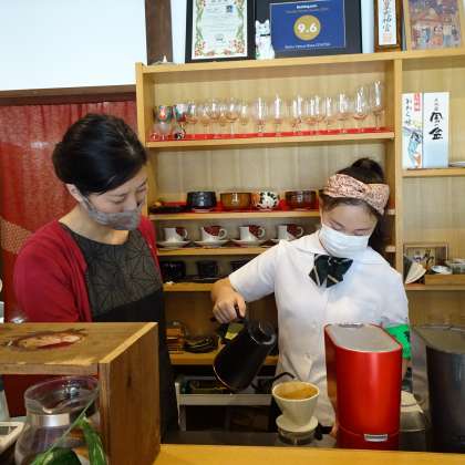 挨拶の仕方やおいしいコ−ヒ−の入れ方など、丁寧に教えていただきました。身につけているのは、昨日自分で作った「ヘアクロスバンド」です。