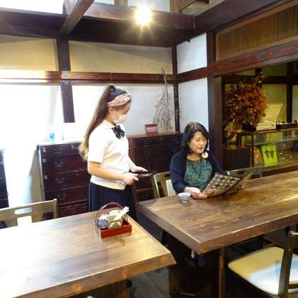 「社会に学ぶ『14歳の挑戦』」最終日は、「越中八尾ベ−スOYATSU」で、接客をしました。