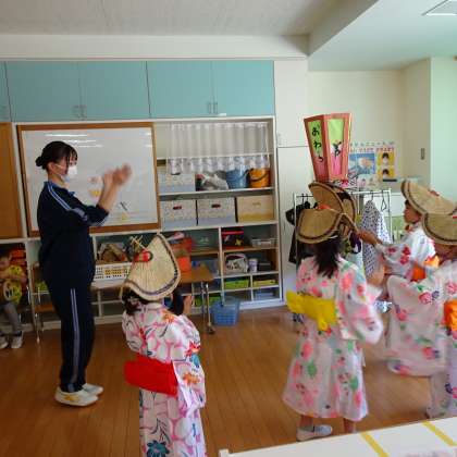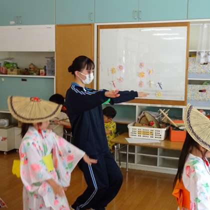 今日は、園児と「おわら踊り」を練習しました。園児のお手本になれるように、一生懸命踊りました。