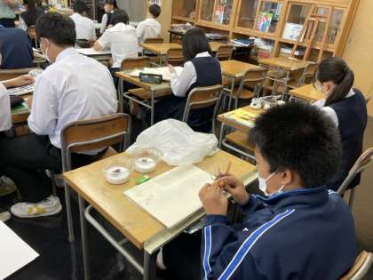 2ーCの美術の授業風景です。身近なもので興味のあるものをモチーフにしてデザイン画を描いています。