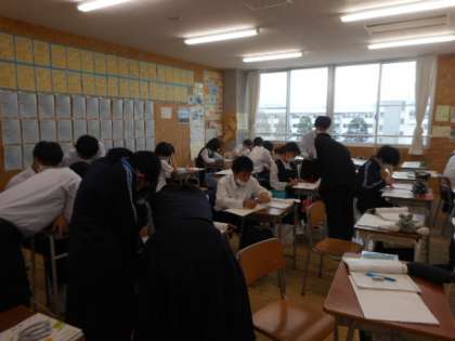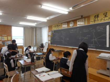 2−Cの数学の授業風景です。1次関数の問題に取り組みました。2年生の数学の授業では、教え合いを行っています。分からない問題を、共に考え教え合うことで理解を深めました。