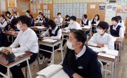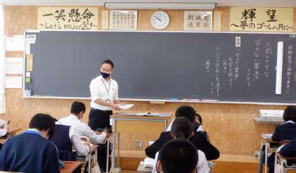 2−Cの国語の授業風景です。「字のない葉書」を学習しての自分の感想や考えをまとめます。先生との掛け合いを楽しみながら、授業の振り返りをしていました。学級目標「一笑懸命」のように、笑顔が絶えない温かい雰囲気です。