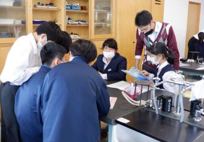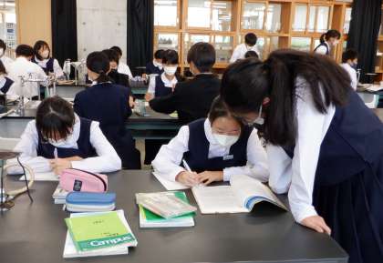 1−Bの理科の授業風景です。今日は明日からの中間考査に向けて、学習事項の確認をしています。分からないところは、友達同士で教え合っています。