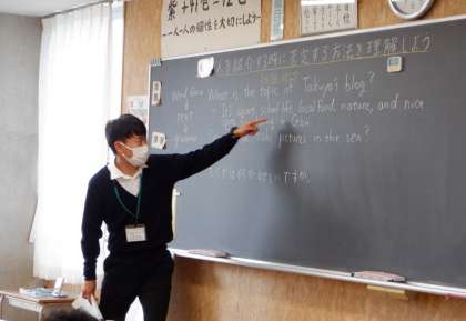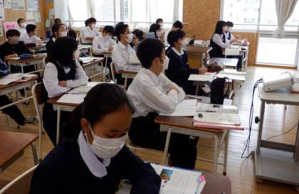 1−Aの英語の授業風景です。英語の学習内容も少しずつ難しくなっていますが、生徒は先生の話をしっかり聞き取り、集中しています。