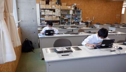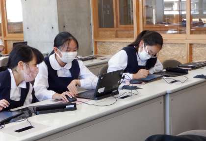 コンピュータ室では、コンピュータ部が集中して活動をしています。誰もしゃべることなく、真剣に作業中。ペンやマウスで、上手にイラストを描いています。