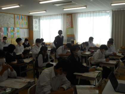 公民の学習 3−A社会 公開日 2022/10/14 更新日 2022/10/14 芝園の一日 10月14日(金) 4限 3−Aの社会科の授業風景です。訴訟問題について学習していました。事例をもとに自分の意見を発表しました。