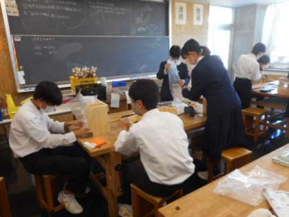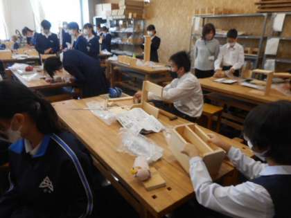 2−Dの技術の授業風景です。木材加工の学習をしています。今日は、釘打ちをして形を作ったあとに、やすりをかけました。それぞれ工夫を凝らして思い思いの作品を作りました。