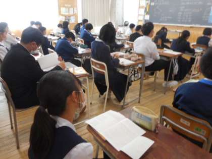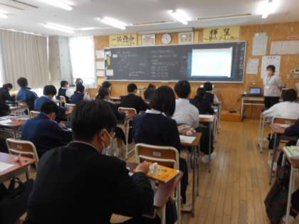 2−Cの数学の授業風景です。多角形の内角の和の求め方について学習しました。規則性を見つけ、計算から求めることができるようになりました。