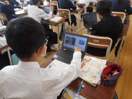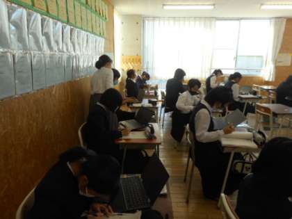 2−Bの英語の授業風景です。クロームブックを活用して、色々な道路標識を調べています。学習した英語表現を使って標識にまつわるクイズを作成しました。