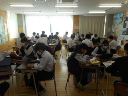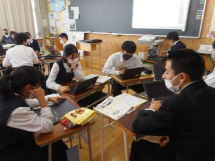 3−Dの社会の授業風景です。公民の分野の学習をしています。グループで話し合いをして政権公約を作成し、発表することを通して理解を深めました。