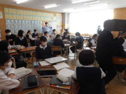 2−Cの社会科の授業風景です。リンカンになりきって、政策を訴えています。グループ発表は、リンカン、秘書官、記者、カメラマンのそれぞれに扮して発表しました。