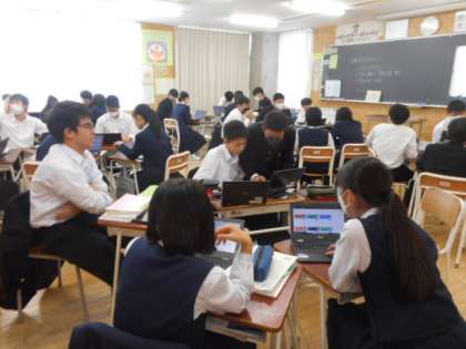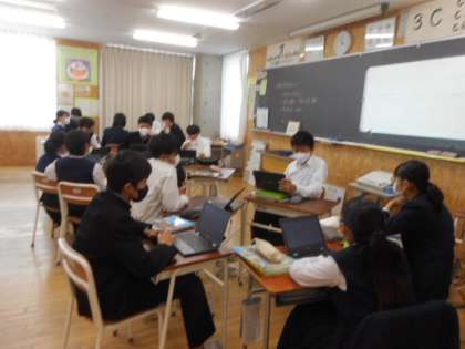 3−Cの社会科の授業風景です。公民の分野の学習をしました。クロームブックを活用してグループで、ある政党になったと想定して政権公約を考えました。課題に主体的に取り組む姿が見られました。