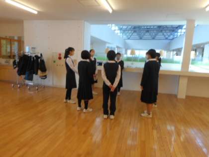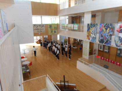 合唱練習(その2) 公開日 2022/10/24 更新日 2022/10/24 芝園の一日 10月24日(月) 放課後の合唱練習の様子です。校舎内の色々な場所を使って練習しています。多目的スペースや教室前廊下からも歌声が響き渡っています。