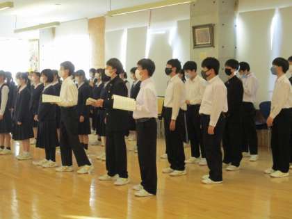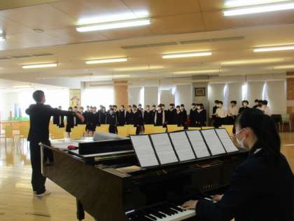 富山市中学校文化祭が、10月29日(土)オーバード・ホールで行われます。本校は作品展示の他に、茶道、合唱等の発表をします。合唱コンクールの練習の後、音楽発表に出演する生徒がランチルームに集まり、「COSMOS」を練習しました。