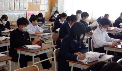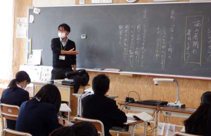1−Aの国語の授業風景です。「言葉をもつ鳥、シジュウカラ」という教材で学習をしています。説明的文章をいかに読む深めるか・・・。頑張っています。
