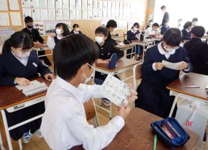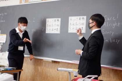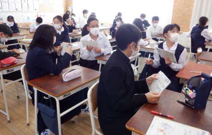 画像は1−Aの英語の授業風景です。ALTの先生と一緒にゲーム活動を取り入れて楽しく学習をしています。