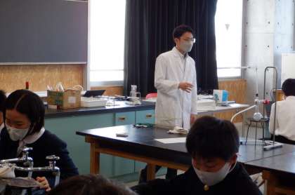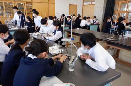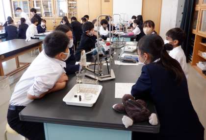 1−Bの理科の授業風景です。エタノールの沸点について、実験をしています。安全に気をつけて。実験は楽しいですね!