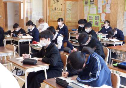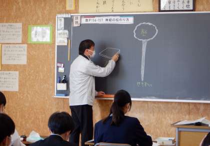 2−Dの理科の授業風景です。神経のはたらきについて学習をしています。脳の命令がどのように神経を伝わってくるか、図を書くと分かりやすいですね。