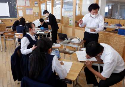 3−Bの英語の授業風景です。一人ずつ英語でスピーチしたことを、聞き取っています。身振り手振りのジェスチャーをつけて、語っている生徒もいます。ステキですね!