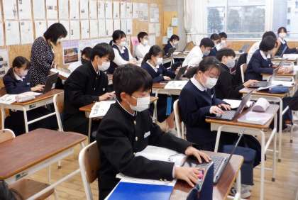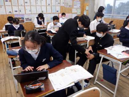 1−Aの家庭科の授業風景です。難しい課題ですが、生徒はこれまで学習したことをもとに、自分の考えをクロムブックにまとめています。クロムブックの使い方もバッチリです!
