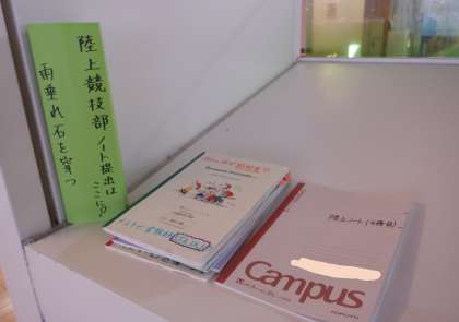 教室棟のフロアの一角に「雨垂 れ石を穿(うが) つ」と書かれたポストがあります。何かな〜とのぞいてみると、陸上競技部の生徒が「部活ノート」を提出していました。