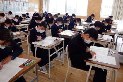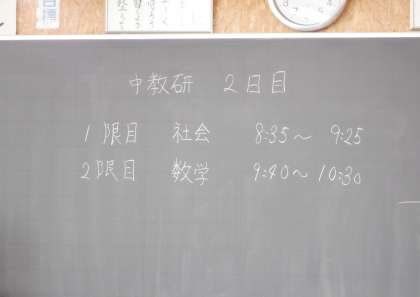 中教研学力調査 2日目 1学年 公開日 2022/11/09 更新日 2022/11/09 芝園の一日 11月9日(水) 1限 朝の冷え込みは厳しかったですが、今は太陽の日差しも温かく過ごしやすい日となりました。昨夜の皆既月食は見ましたか?とっても幻想的でしたね。 さて、今日は中教研学力調査の2日目です。 画像は1年生です。社会科に取り組んでいます。頑張ってます!