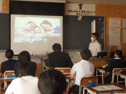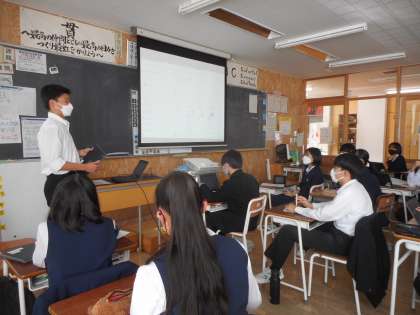 3学年では、「ウエルビーイングの実現を目指して」をテーマに追究した成果を発表しています。クラスメイトとやりとりしたり、質問したりして、ただ一方的に伝えるのではなく、様々な発表の工夫をしていました。