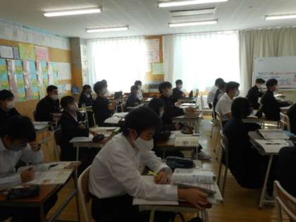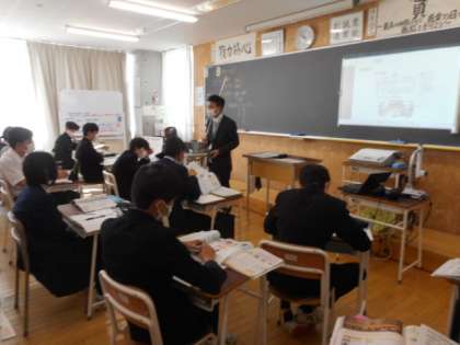 3−Aの社会科の授業風景です。裁判の仕組みついて学習しました。様々な事例を基にしながら、裁判がどのように行われているか確認しました。