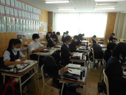1−Aの書写の授業風景です。心を落ち着けて、一筆一筆を丁寧に書いています。書写を通して、文字を「正しく 速く 整えて」書くことを覚えます。