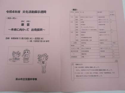 文化活動展示週間 公開日 2022/11/14 更新日 2022/11/14 芝園の一日 11月14日(月) 明日から22日(火)までを「文化活動展示週間」とします。 授業や部活動で取り組んだ作品等を校内に展示します。 保護者の皆さんには、授業参観や進路懇談会で来校された折に、ご覧ください。