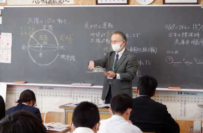3−Dの理科の授業風景です。太陽の日周運動について学習をしています。「南中って、どういうこと?」生徒は、疑問に思ったことを素直に発言し、授業がさらに深まっていきます。