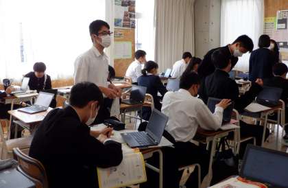 日本の文化を紹介しよう 3−C英語 公開日 2022/11/18 更新日 2022/11/18 芝園の一日 11月18日(金) 2限 3−Cの英語の授業風景です。「日本の文化について、英語でスピーチしよう」という課題でスピーチ原稿を作成しています。 和食、着物、扇子など・・・。中には「日本のはんこ文化」についての提言を考えている生徒もいます。 一人で追究したり、友達と教え合ったりと、生徒は主体的に問題解決に取り組んでいます。