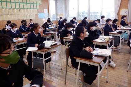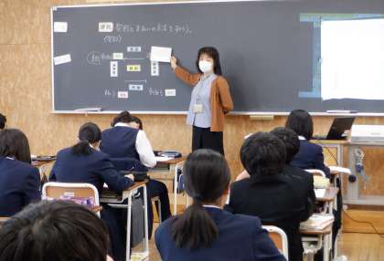 2−Bの家庭科の授業風景です。いろいろな販売方法を知り、適切な選択、購入の態度を身につけることをねらいとして学習をしています。